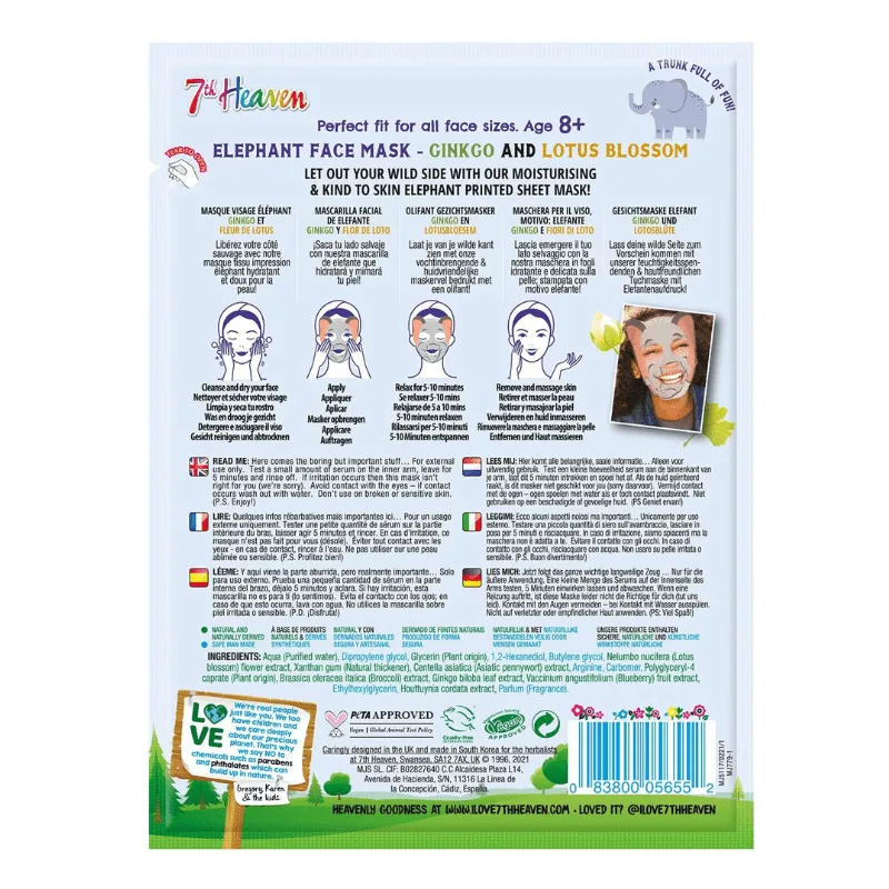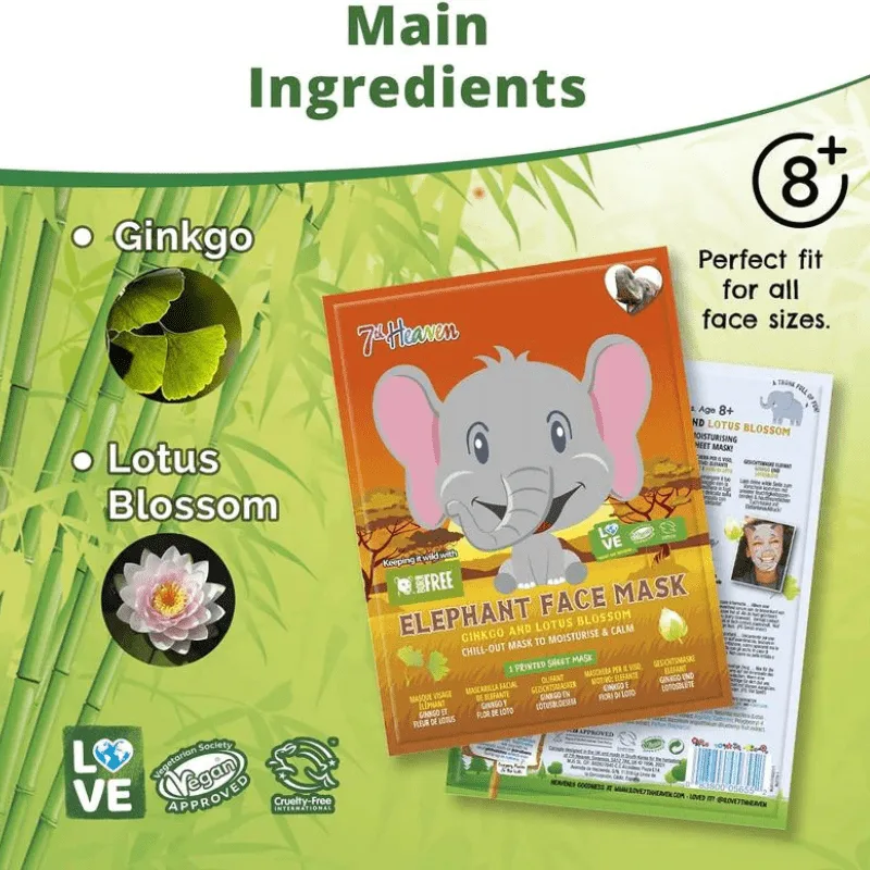7th Heaven Food Born Free Elephant Face Ginkgo & Lotus Blossom 25gr – Μασκά Ομορφίας Πανί Με Σχέδιο Ηλικίες 8+ Vegan