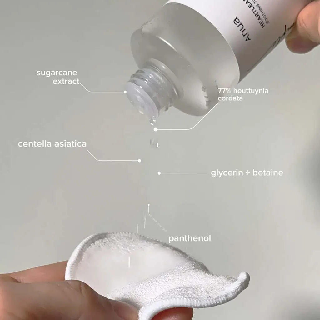 Ένα καταπραϋντικό τόνερ με σύνθεση που περιέχει εκχύλισμα Heartleaf, σχεδιασμένο για να καταπραΰνει τον ερεθισμό και να ενυδατώνει το δέρμα.