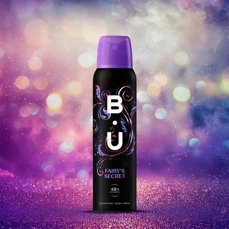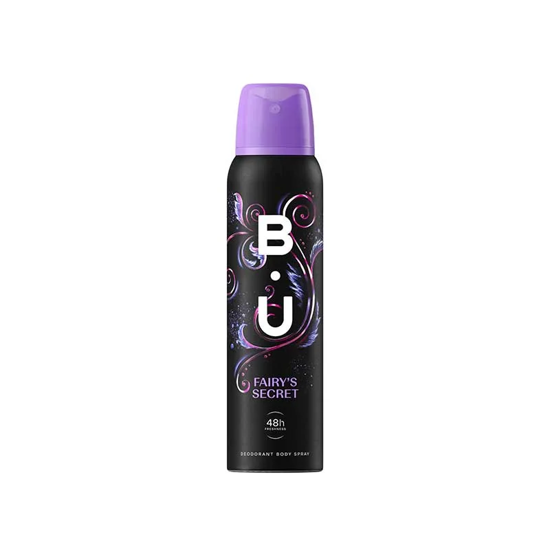 Αποσμητικό σώματος με άρωμα B.U. fairy’s secret σε μορφή σπρέι. Καταπολεμά την κακοσμία, αντιμετωπίζοντας τα βακτήρια και τους μικροοργανισμούς που την προκαλούν. Τα βασικά ενεργά συστατικά του αποτελούνται κυρίως από παράγωγα φαινόλης, αιθανόλης και αιθέριων ελαίων, τα οποία εμποδίζουν τον βακτηριδιακό πολλαπλασιασμό χωρίς, ωστόσο, να εμποδίζουν την έκκριση ιδρώτα.