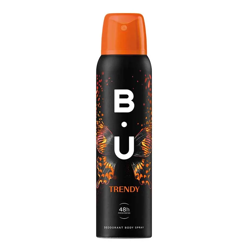 Αποσμητικό σώματος με άρωμα B.U. trendy σε μορφή σπρέι. Καταπολεμά την κακοσμία, αντιμετωπίζοντας τα βακτήρια και τους μικροοργανισμούς που την προκαλούν. Τα βασικά ενεργά συστατικά του αποτελούνται κυρίως από παράγωγα φαινόλης, αιθανόλης και αιθέριων ελαίων, τα οποία εμποδίζουν τον βακτηριδιακό πολλαπλασιασμό χωρίς, ωστόσο, να εμποδίζουν την έκκριση ιδρώτα.