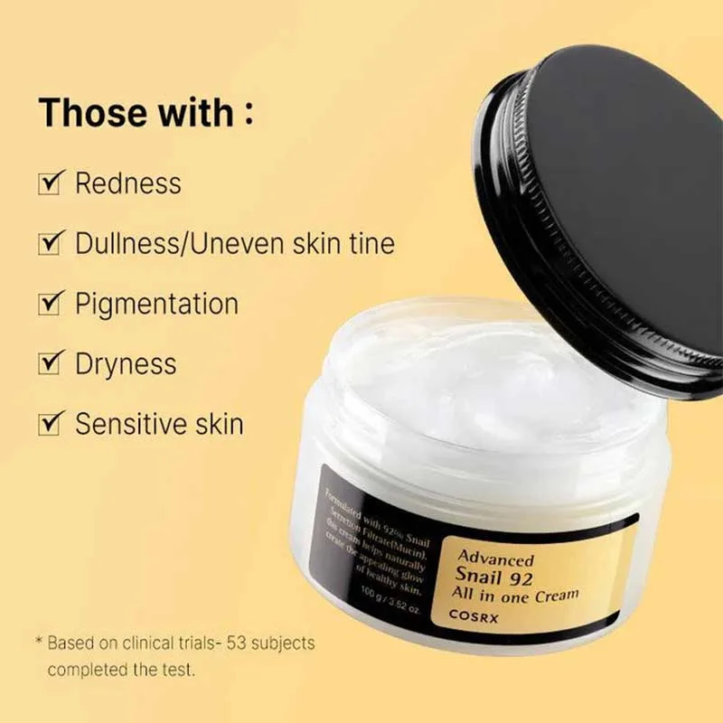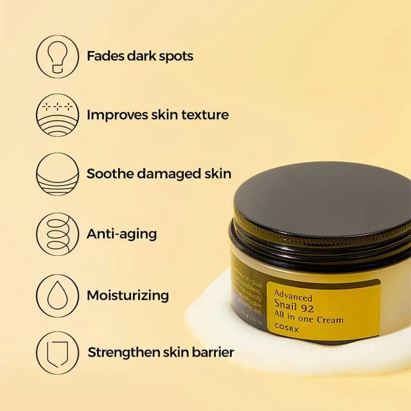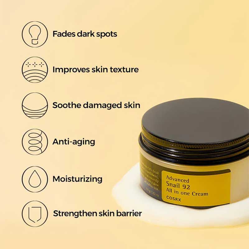 Η Cosrx Advanced Snail 92 All in one Cream είναι μια Κρέμα Προσώπου με 92% περιεκτικότητα σε έκκριμα σαλιγκαριού.