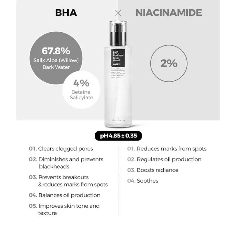 Η Cosrx BHA & Niacinamide Blackhead Power Liquid είναι μια λοσιόν απολέπισης, ρύθμισης της λιπαρότητας του δέρματος και αφαίρεσης των μαύρων στιγμάτων
