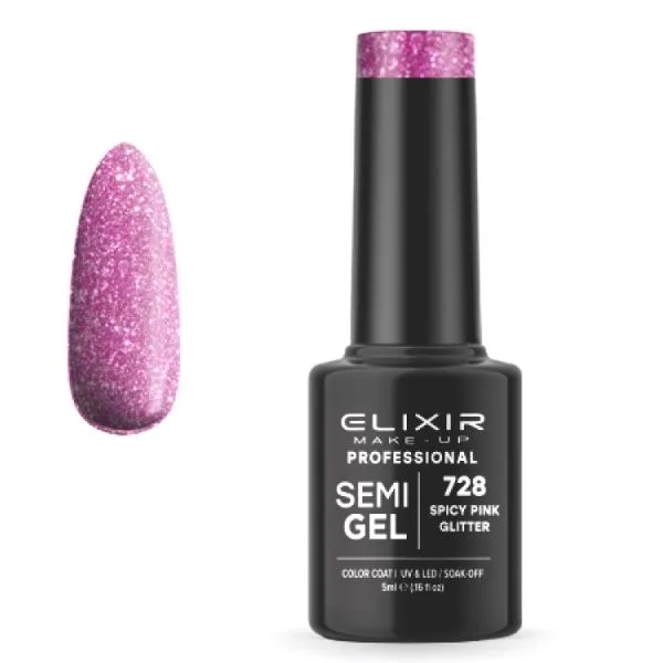 Elixir Professional Semi Gel Ημιμόνιμο Βερνίκι Νυχιών 728 Spicy Pink Glitter Ροζ Συμπαγές Shimmer 5ml