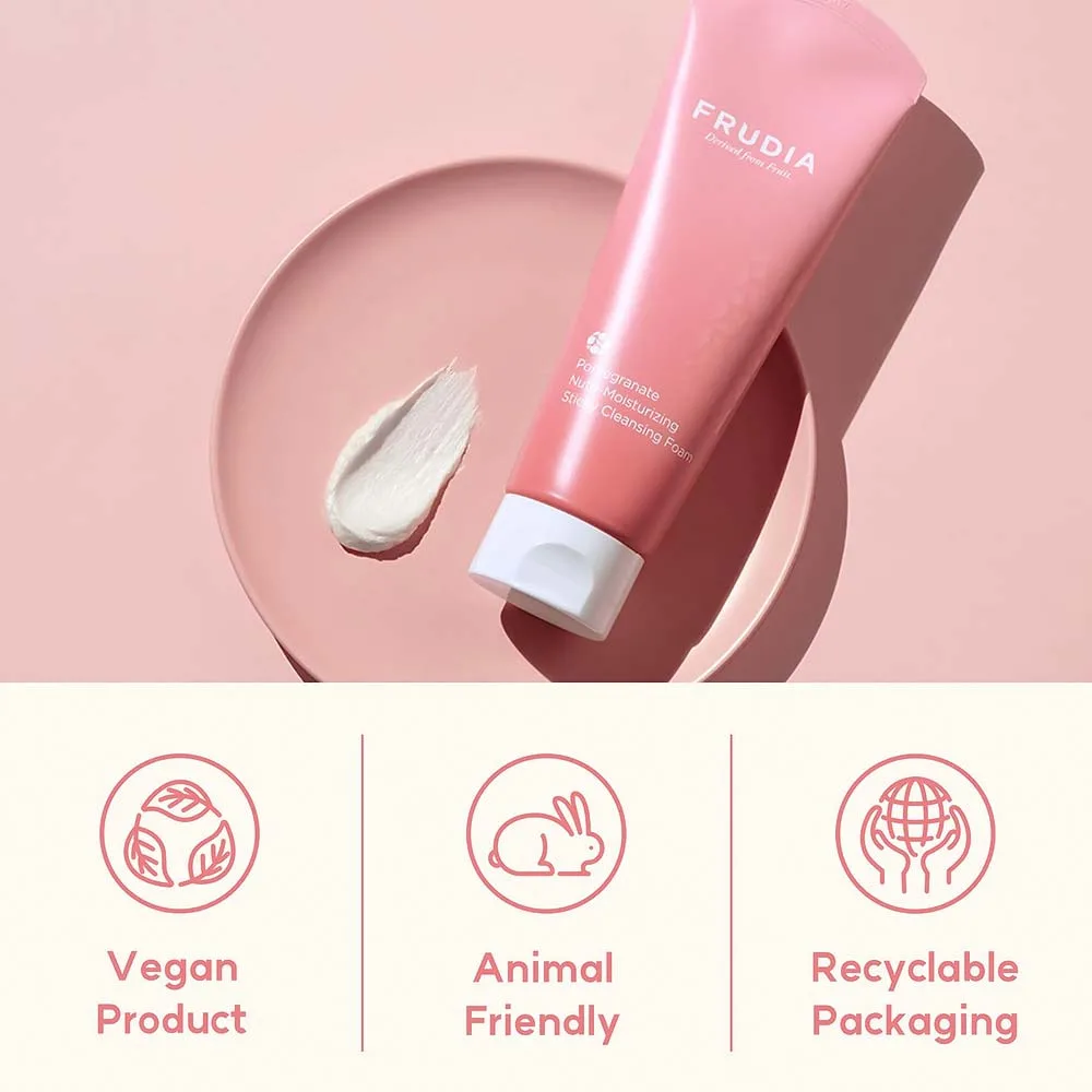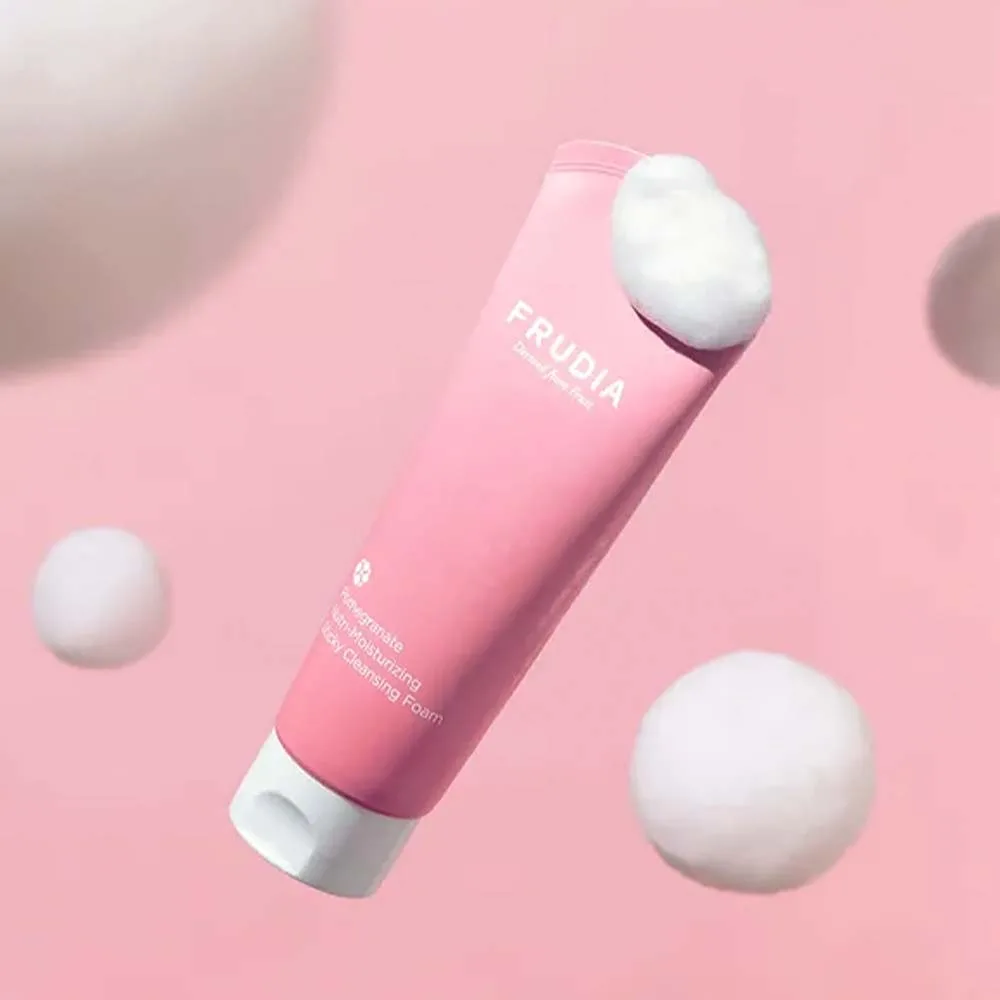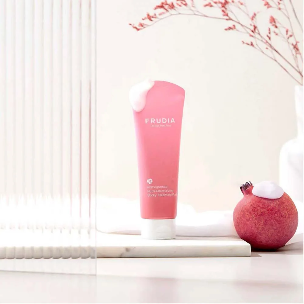 Θρεπτικός – ενυδατικός κολλώδης αφρός καθαρισμού FRUDIA Pomegranate με εκχύλισμα ροδιού που αφαιρεί τους ρύπους και με τις μικροφυσαλίδες του, αφήνοντας το δέρμα σφριγηλό και ενυδατωμένο.