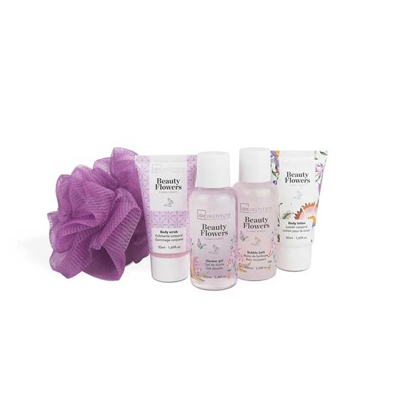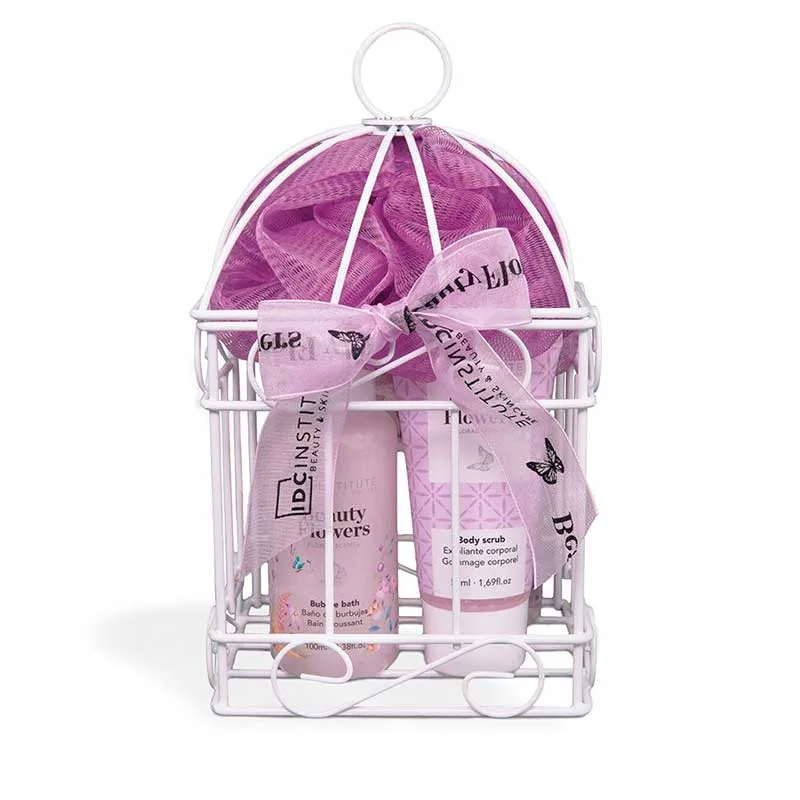 IDC Beauty Flowers Purple Cage Gift Set 100ml Shower Gel, 100ml Bubble Bath, 50ml Body Lotion, 50ml Body Scrub & Sponge Puff