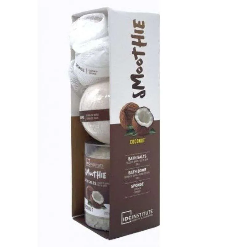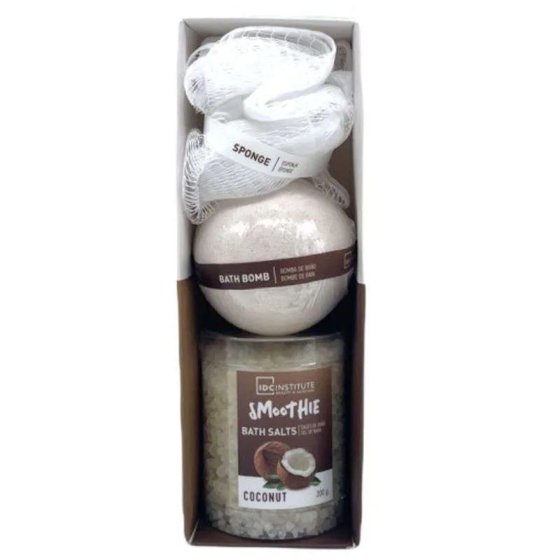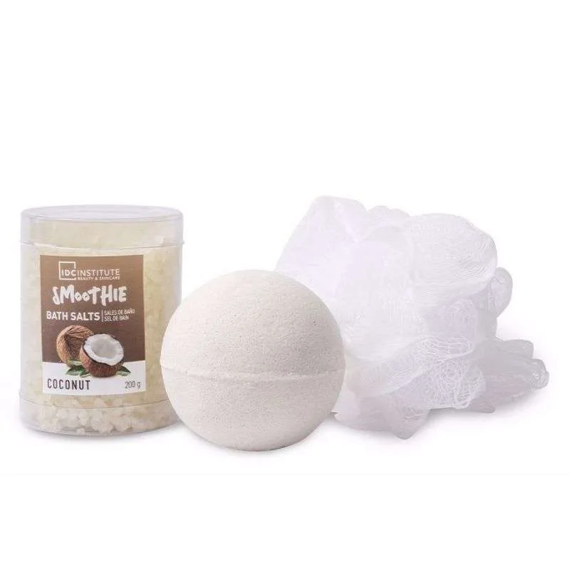 IDC Institute Smoothie Bath Set Coconut Άλατα 200gr , Μπάλα Μπάνιου 140gr & Σφουγγαράκι