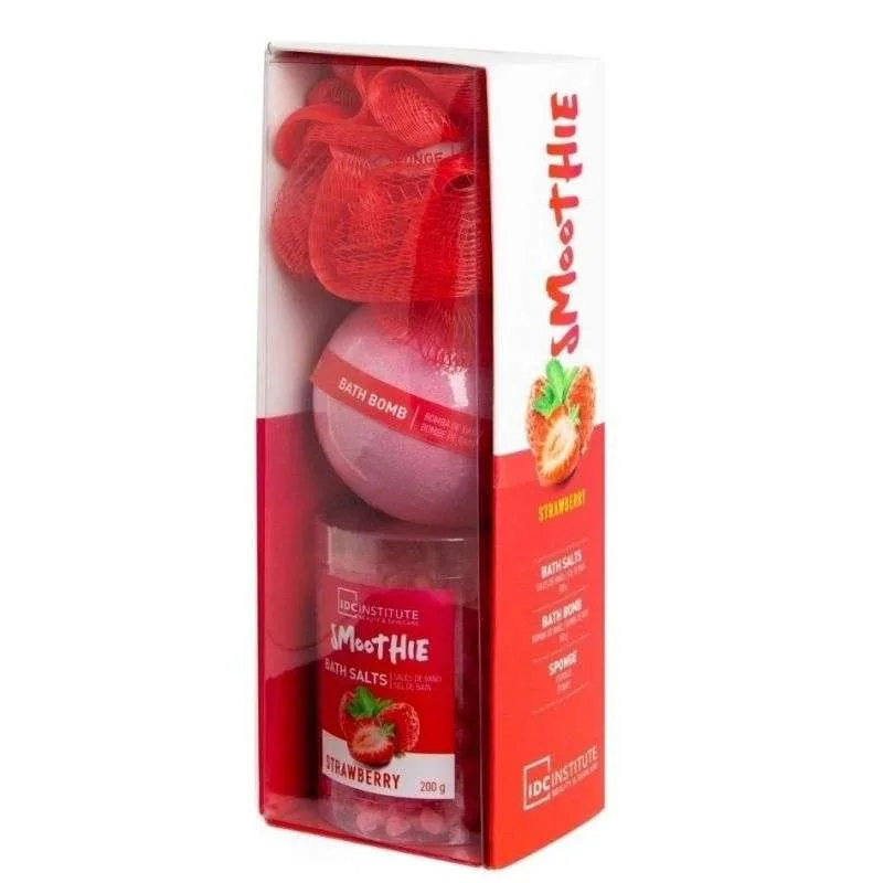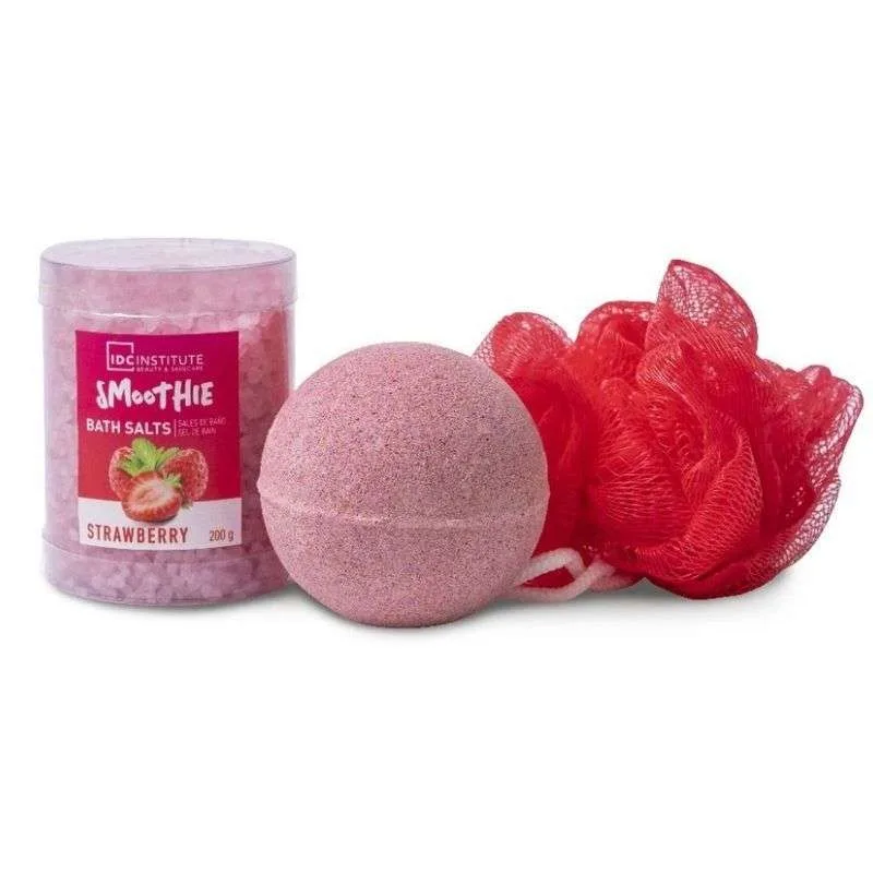 IDC Institute Smoothie Bath Set Strawberry Άλατα 200gr , Μπάλα Μπάνιου 140gr & Σφουγγαράκι