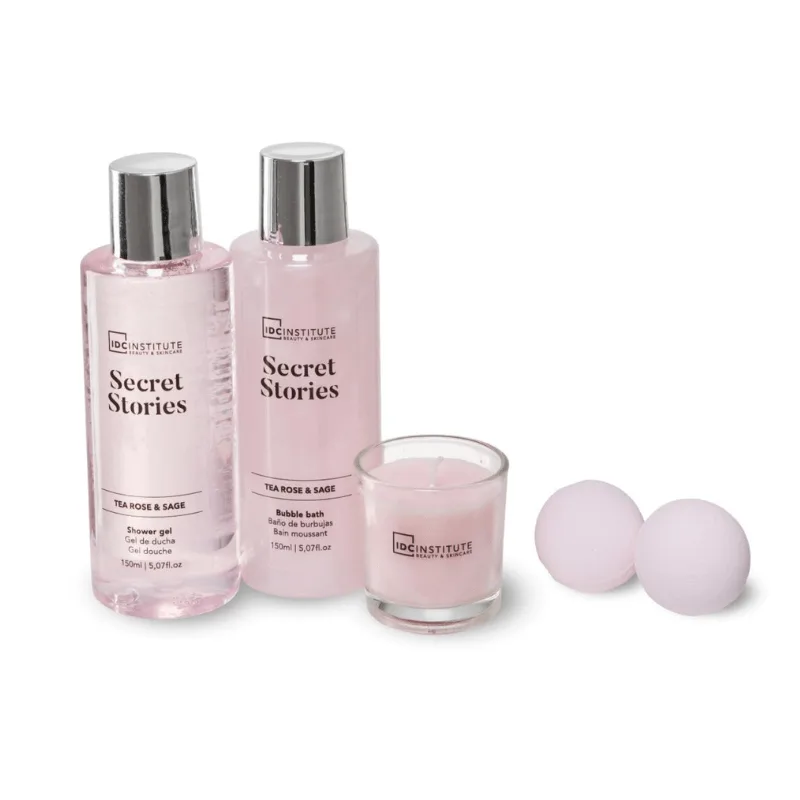 IDC Secret Stories Tea Rose & Sage Relax Gift Set – 150ml Shower Gel, 150ml Bubble Bath, 30g Candle & 2*20g Bath Fizzer