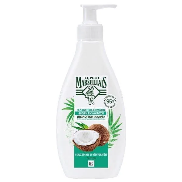 Το Le Petit Marseillais 48H Moisturising Soothing Body Lotion με Βιολογική Καρύδα Με την κρεμώδη υφή και το λεπτό άρωμα, διεισδύει γρήγορα χωρίς να αφήνει λιπαρότητα και ενυδατώνει διαρκώς, για απίστευτα απαλότερο δέρμα και αίσθηση ευεξίας όλη την ημέρα.