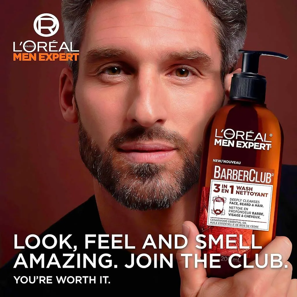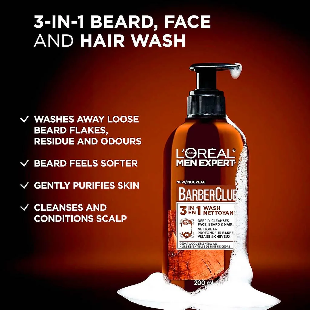 Τo Barber Club Beard, Face & Hair Wash από τη σειρά Men Expert της L’Oréal είναι προϊόν καθαρισμού 3 σε 1 με αιθέριο έλαιο κέδρου, ειδικά σχεδιασμένο για τη βέλτιστη φροντίδα και τον εντατικό καθαρισμό του προσώπου, των γενιών και των μαλλιών.