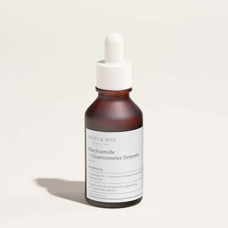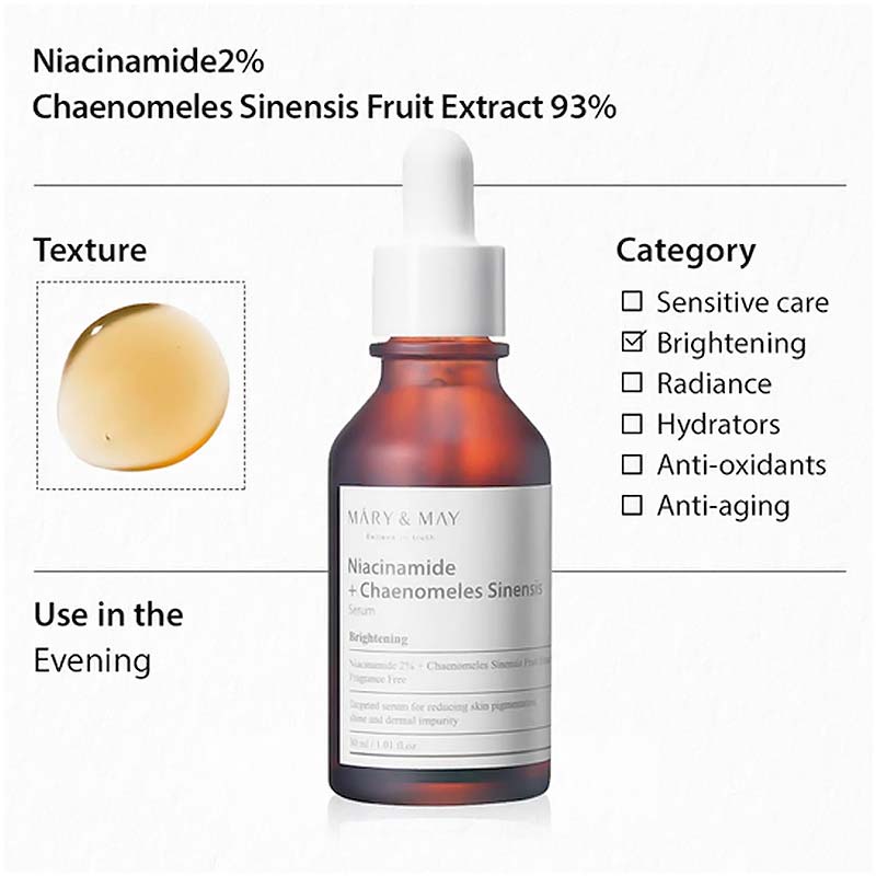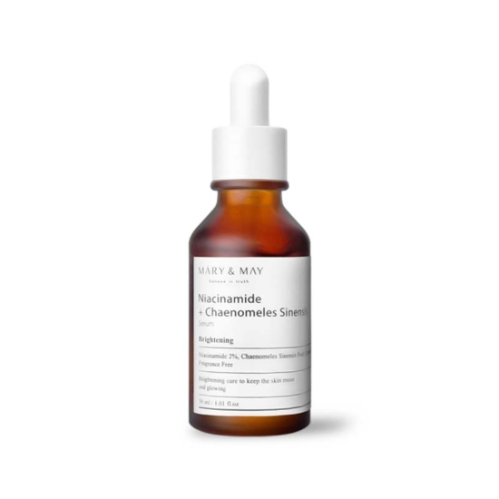 Ο ορός Mary & May Niacinamide & Chaenomeles Sinensis περιέχει 2% νιασιναμίδη και 93% εκχύλισμα φρούτων Chaenomeles Sinensis ή αλλιώς εκχύλισμα κινέζικου κυδωνιού. O ορός αυτός υπόσχεται να φωτίσει το δέρμα, να ρυθμίσει την παραγωγή σμήγματος και να εξομαλύνει λεπτές γραμμές και ρυτίδες.
