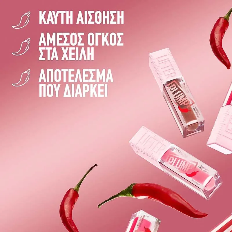 Γνωρίστε το Lifter Plump, το lip plumping gloss της Maybelline New York. Με Maxi Lip ™ και chili pepper. Προσφέρει έντονη αίσθηση θερμότητας & εφέ όγκου στα χείλη στην στιγμή. Διατίθεται σε 6 hot αποχρώσεις.