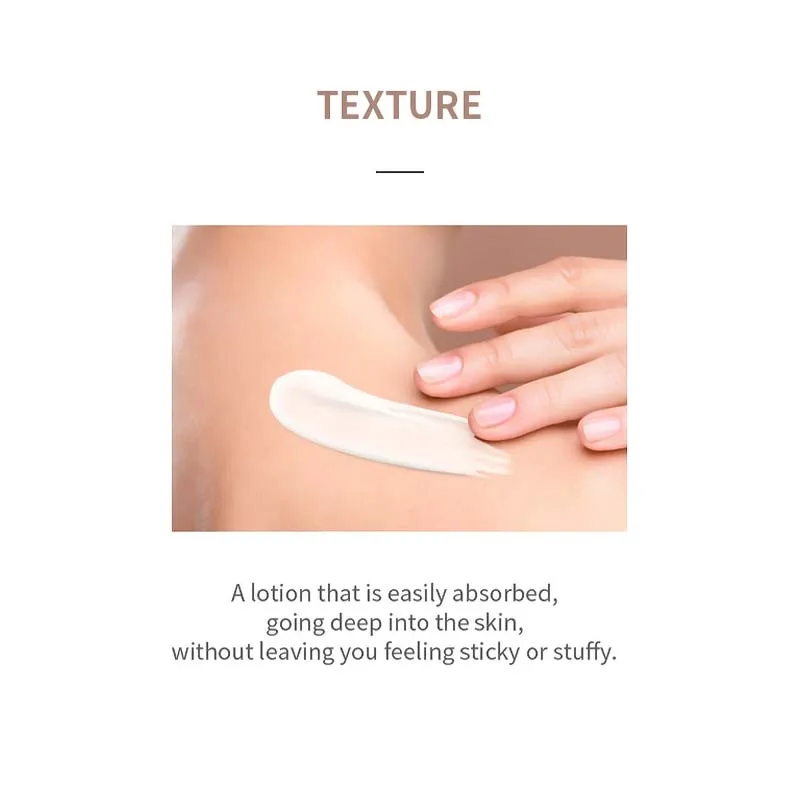 Το προϊόν περιέχει AHA , το οποίο βοηθά στην εξάλειψη των νεκρών κυττάρων του δέρματος. Αφαιρεί τα νεκρά κύτταρα του δέρματος στην επιφάνεια του χωρίς να το ερεθίζει, αφήνοντάς το λείο. Το AHA επανορθώνει το κατεστραμμένο δέρμα και έχει καταπραϋντική δράση. Επομένως, η λοσιόν σώματος είναι κατάλληλη για τραχύ και ξεφλουδισμένο δέρμα, για άτομα που πάσχουν από κεράτωση pilaris ή «δέρμα κοτόπουλου» , καθώς και για σκούρο και θαμπό δέρμα.