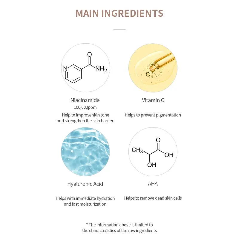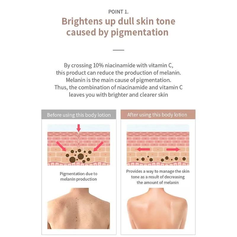 Συνδυάζοντας 10% νιασιναμίδη και βιταμίνη C , αυτό το προϊόν μπορεί να μειώσει την παραγωγή μελανίνης. Η μελανίνη είναι η κύρια αιτία της μελάγχρωσης. Ο συνδυασμός νιασιναμίδης και βιταμίνης C κάνει το δέρμα σας να φαίνεται πιο λαμπερό και καθαρό.