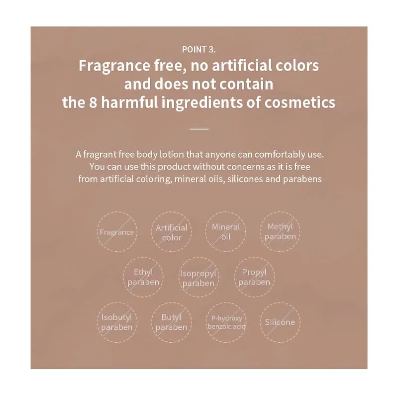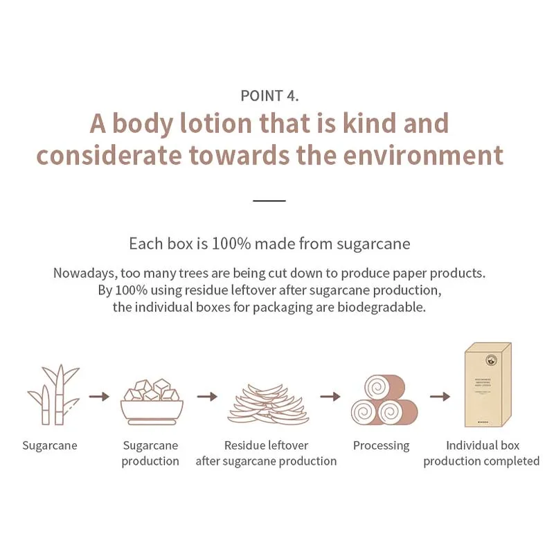 Κάθε κουτί είναι κατασκευασμένο από 100% ζαχαροκάλαμο . Είναι βιοδιασπώμενο και η ετικέτα αφαιρείται εύκολα με νερό. Μια λοσιόν σώματος χωρίς άρωμα που όλοι μπορούν να χρησιμοποιήσουν χωρίς δισταγμό, καθώς δεν περιέχει τεχνητά χρώματα, ορυκτέλαια, σιλικόνες και paraben.