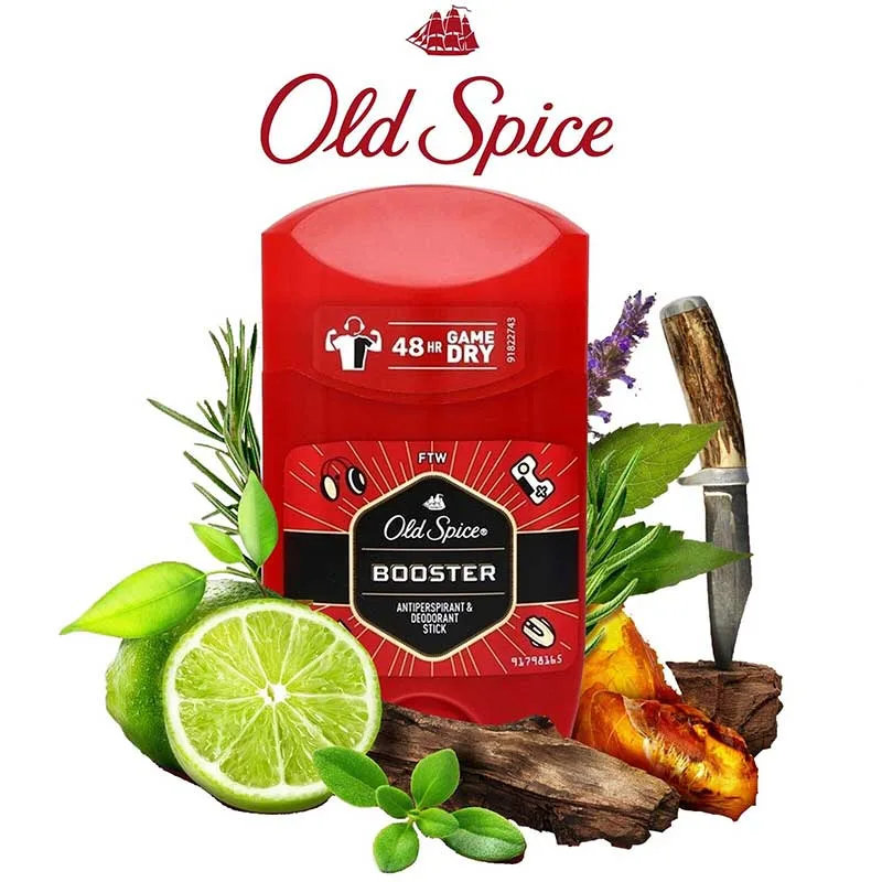 Old Spice Booster 48hr Game Dry με αρενωπό άρωμα. Ένα αποσμητικό για άντρες που σε βοηθά να απαλλαγείς από τις δυσάρεστες οσμές και κάνει τις μασχάλες σου να μυρίζουν σαν μια άγρια, αναζωογονητική περιπέτεια σε έναν ανεξερεύνητο τόπο.