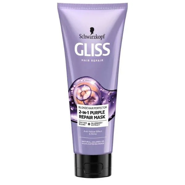 Πείτε αντίο στις ανεπιθύμητες κίτρινες και πορτοκαλιές αποχρώσεις των μαλλιών σας με το Gliss Blonde Hair Perfector 2 In 1 Purple Repair Mask- Μάσκα κατά του κιτρινίσματος των μαλλιών !