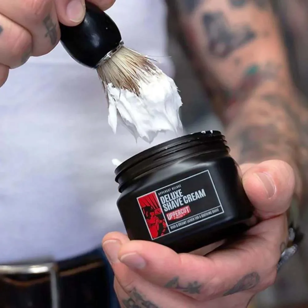 - Εφαρμόστε μικρή ποσότητα Uppercut Deluxe Shave Cream στις παλάμες σας και απλώστε τη στο πρόσωπο ή χρησιμοποιήστε πινέλο ξυρίσματος για πιο πλούσιο αφρό.