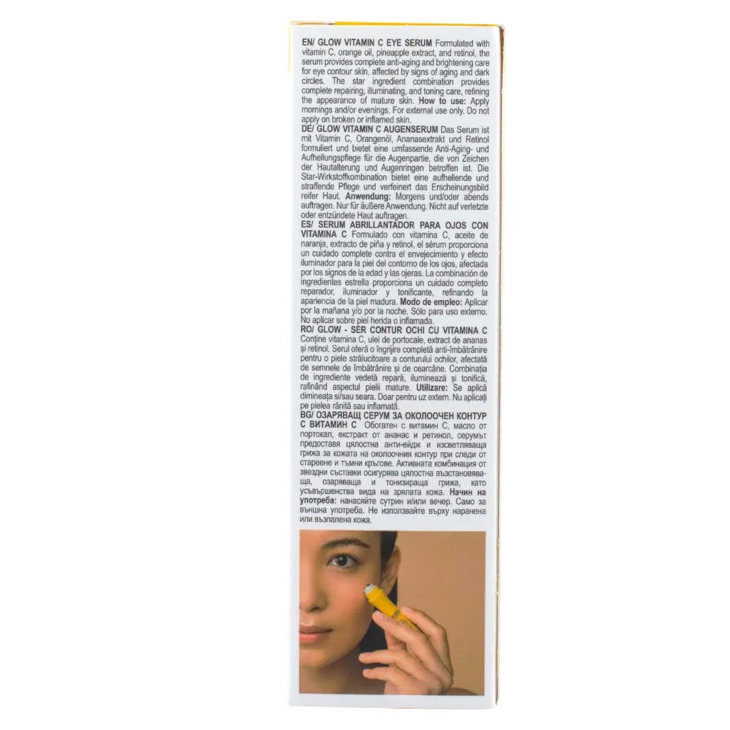 Ο ορός, που περιέχει βιταμίνη C, έλαιο πορτοκαλιού, εκχύλισμα ανανά και ρετινόλη, παρέχει ολοκληρωμένη περιποίηση για το περίγραμμα των ματιών, μπορεί να μειώσει τα ορατά σημάδια γήρανσης και τους μαύρους κύκλους στην περιοχή των ματιών.
